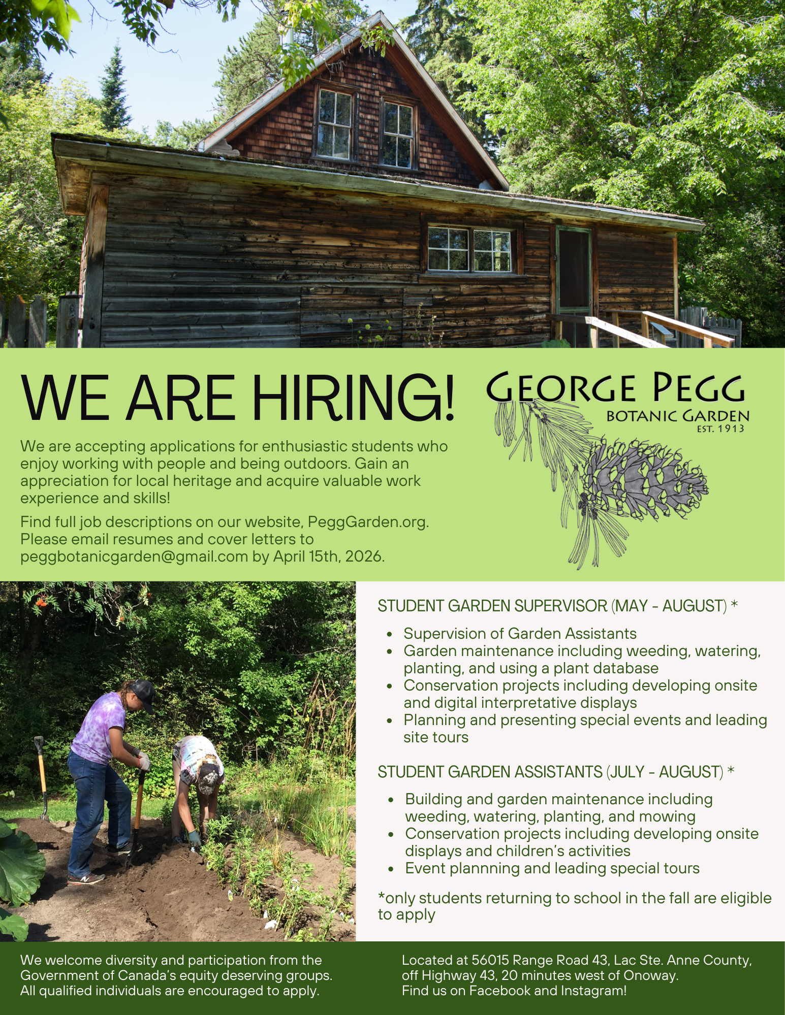 Garden Supervisor. We are seeking a 15 - 30 year old youth for full time work, mid-May to end of August. Please apply by April 15th, 2026.