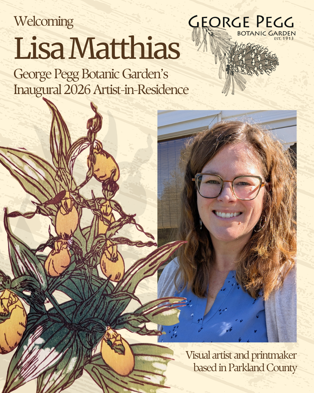 During the 2026 garden season, local artist and ecologist Lisa Matthias will be George Pegg Botanic Garden’s inaugural Artist-in-Residence! Lisa will undertake an interdisciplinary project combining botanical research, experimental printmaking, and public engagement. Working directly with the living garden collections and historic herbarium specimens associated with George Pegg, she will create new artworks like woodcuts and etchings that examine Alberta plant life from individual leaves and herbarium notes to whole garden landscapes shaped by climate and cultivation. Visitors will be invited into the process through on-site artist-in-residence days, including demonstrations and hands-on activities that connect botanical science with contemporary art. The residency will culminate in an on-site exhibition of new work created at the garden, offering audiences a unique and layered experience of local plant history, ecology, and creative practice.